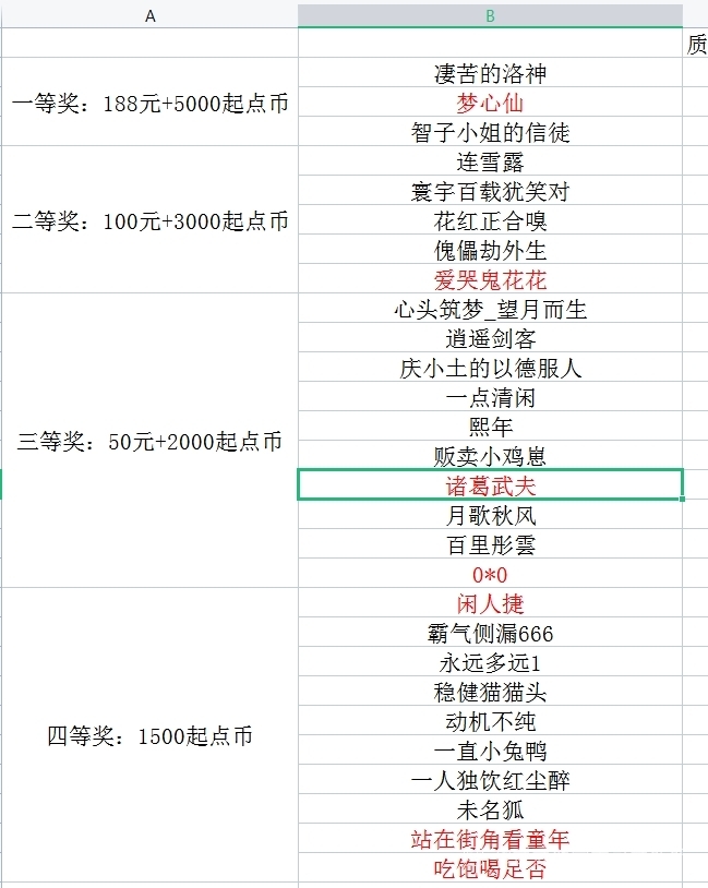 好耶!感谢大家的参与!大家看下获奖名单,获奖的书友加群找我领奖!有问题的书友也可以滴滴进群找我!公示期为:11月14到11月16日。有问题的书友可以在17号之前进群找我咩!17号开始发奖!获奖者凭借主页面截图和已发帖子截图滴滴我!起点币我会准时发下去,其他的为期一个星期,超过一个星期没有来找我,就作废啦!所以速度找我!红色标记是称号获得者!另外参加的小朋友记得来抽奖!!!!