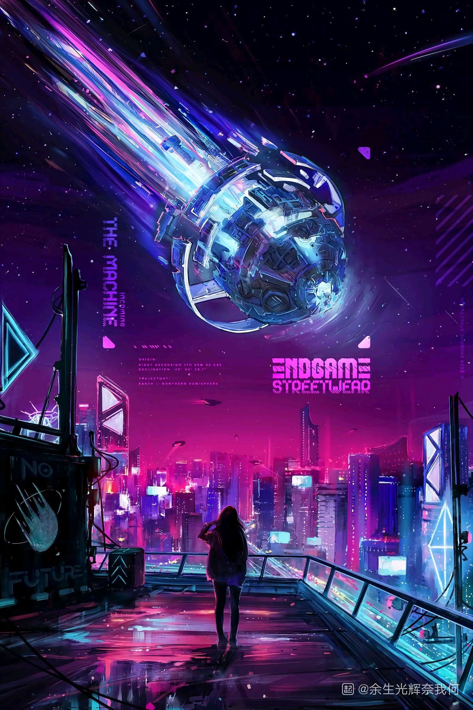 夜幕下,人类的建筑物密密麻麻,红蓝色的霓虹灯闪烁。