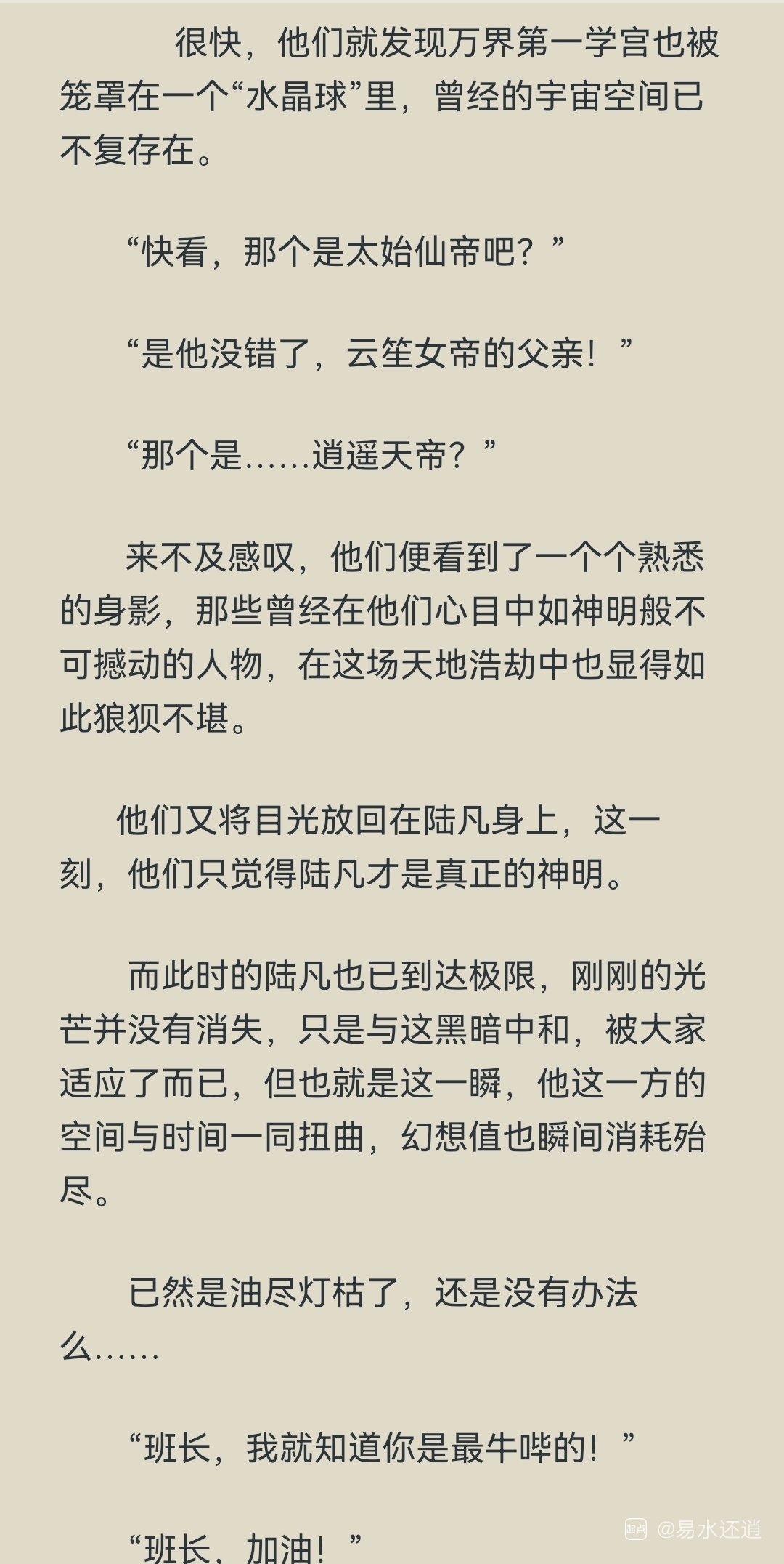 作者更新太慢了,导致我天天做梦,只能自己臆想后面的剧情,崩溃[fn=12][fn=12][fn=12]废话不多说,欢迎来到易水的梦境(第一次写同人文,不是很熟悉,希望明月大大给加个精,别不识好歹,别逼我给你跪下[fn=36])这片“漆黑”的屏障究竟是什么?它似乎距离还十分遥远,在学宫的半边却仿佛已被吞噬……空间似乎早已被扭曲了,已然分不清方向,不论从哪个角度看去,都仿佛一望无际,但当顺着那“黑幕”向下看时,那所谓的无尽天涯,又仿佛近若咫尺。整个学宫宛如都已被从原来的世界剥离……已然是一代仙帝的姜云笙望着这不断逼近的“黑幕”也是束手无策。“触碰到的人都已失了神智,校长好不容易冲出去,这么长时间了,也没个消息。这……这究竟是个什么啊?”姜云笙弯起大拇指敲了敲紧锁的眉头,神色稍有舒展,将手一摊,一道金色圣符赫然出现。“父亲,求你看到吧……。”姜云笙说着,金色圣符瞬间腾空而起,冲上云霄,她满眼泪光,希翼的望着那道飘飞的金色圣符。圣符飘至半空,开始沿着黑幕边缘飘动,似在寻找能够逃遁出去的空间。但就在其环绕一周时,空间突然开始剧烈扭曲,无论从哪个方向看过去,圣符都停在头顶不动了。下一刻,圣符如灯灭般消失,空间再次“平稳”了下来,一切仿佛什么都没有发生。“唉,成功了吗?”“应该没问题的吧,毕竟是云笙女帝!”“是啊是啊,云笙女帝出手肯定是值得放心的!”众人只能通过这种方法安慰自己,毕竟如果连姜云笙也没办法的话,他们可就真的没有希望了。“唉,女帝她为什么不说话呀?”大家突然间都向这人看去,这一句话仿佛打破了他们的幻想。是啊!为什么不说话?如果成功了的话早就喊出来了,毕竟受困了这么久……姜云笙一脸的绝望,他昂首望着那漆黑的“天空”,不禁有些崩溃,“父亲!我究竟该怎么做?”在这种时候,姜云笙第一时间想到的是他的父亲,那个曾在她心目中无所不能的男人——太始仙帝!但就是这个曾经给过他无数鼓励的男人,此刻却也没了声息。他在哪儿?不知道。姜云笙崩溃的只想哭出来,但是就连这她也做不到。突然,一只大手盖在了他的肩膀。姜云笙愣了一下,回头看去,是柯子越。如今的柯子越也早已是半部仙帝之姿,不时间透露出的剑意也有了几分当年陨荒剑帝的气概。“你忘了班长曾对你说过的话了吗?若问谁人配完美,唯有一班姜云笙!如今你这般丧气,又让同学们怎么看?让全体师生们怎么看!”“我……”姜云笙的眼中重有了一丝明亮,但依然带着几分踟躇。“这种时候可不能轻言放弃啊!”“若问世间谁完美,唯有一班姜云笙……”姜云笙喃喃着,她看着柯子越那真诚的眼神,他想起了那个家伙,此时的他和那家伙是多么的像啊!他也爱说那样的话,总是爱那样的大大咧咧,总是让她那么看不透。但此刻,她想明白了,他相信那家伙现在肯定看着这一切,她绝不能在他面前出丑,所以她不能输,要让他看看她姜云笙也不是吃醋的!“陆凡,你看着吧!我云笙女帝绝不会出丑,你就静静的在一旁看着吧,我会解决这一切!”姜云生说着,身上再次爆发出一股强大的力量,就连已是半步仙帝的柯子越,也不禁遮住了眼睛不觉倒退了几个身形。姜云笙再次悟道,虽然没有陆凡道韵天成光环的加持,但此刻,她却抱上了必死的决心,她要用她的生命守护万界第一学宫,直到那最后一刻……因为……若问世间谁完美,唯有一班姜云笙!“好!若问世间谁完美,唯有一班姜云笙!”刻字月的声音响彻整个学宫,即刻便被“回声”淹没。“若问世间谁完美,唯有一班姜云笙!”“云笙女帝,快一掌拍碎了那个破屏障!”“云笙女帝,你果然是最牛哔的!”万界第一学宫再次沸腾了起来,全体师生的目光都集中在了那道闪着耀眼光芒的倩影身上。“陆凡,你看到了吗?我不会比你差!”…………此刻,在一混沌空间。“这是哪……为什么……为什么我什么都不知道……不记得……”陆凡想要睁开双眼,但他做不到,他甚至感知不到自己的身体。“你醒了?”一道声音在他的脑海中响起。“你是谁……”声音没有回答,下一刻,他仿佛从梦中惊醒,记忆如潮水般涌来,他似乎重获新生。这是一个极白空间……“感觉怎么样?”他面前的那位老者问道,正是当初帮他穿越的“阿拉丁老爷爷”。“像一场梦……”陆凡神情恍惚,但忽然间恍若惊醒了过来,“我死了吗?”“嗯。”“可我已经是仙帝!”“嗯!”“可我有系统!”“嗯。”“你帮助我穿越,难道我不是主角吗?”“那又如何?”“我不能死……”陆凡有些茫然。“所以呢?”老者一副事不关己的样子,似乎这件事跟他没有半毛钱关系。“我得回去,我要……”陆凡执着的喊道。“你的故事已经结束了,那个世界已经开始坍塌,不久后就会被整个抹除,不会有人再记得它,包括你!”在老者看来这一切都命已注定,陆凡只是还不适应罢了,也不需要去适应不适应,等到那个宇宙完全被抹除干净,他的记忆也就消失了。陆凡愣了愣,他也没想到事情已经到了如此地步,但他还有一丝念想,于是试探性的问道:“我能再看一眼那个世界吗?”老者没有说话,只是轻轻抖了抖袖子,一缕云烟从中飘出,绘出一抹画面。画面中的姜云笙浑身散发着圣光,立于学宫正中心的半空,玄妙的灵力抵抗着黑幕的侵蚀,大家也都在与这股不明力量做着抵抗。他看到了柯子越、慕容逆天、林瑶玉,还有大黄……但他们这帮人又怎么可