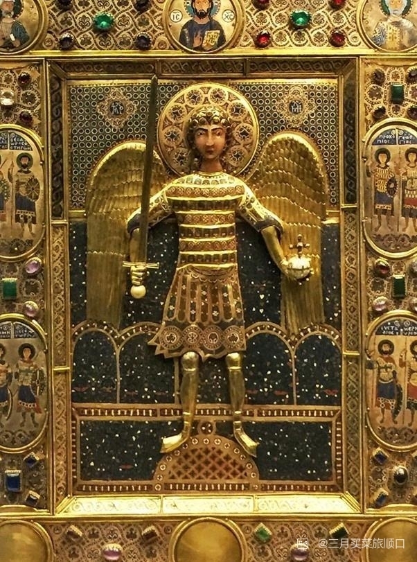 意大利威尼斯圣马可大教堂收藏的圣像,出自拜占庭,金质,嵌有半宝石以及珐琅,塑造了了全副武装的大天使米迦勒