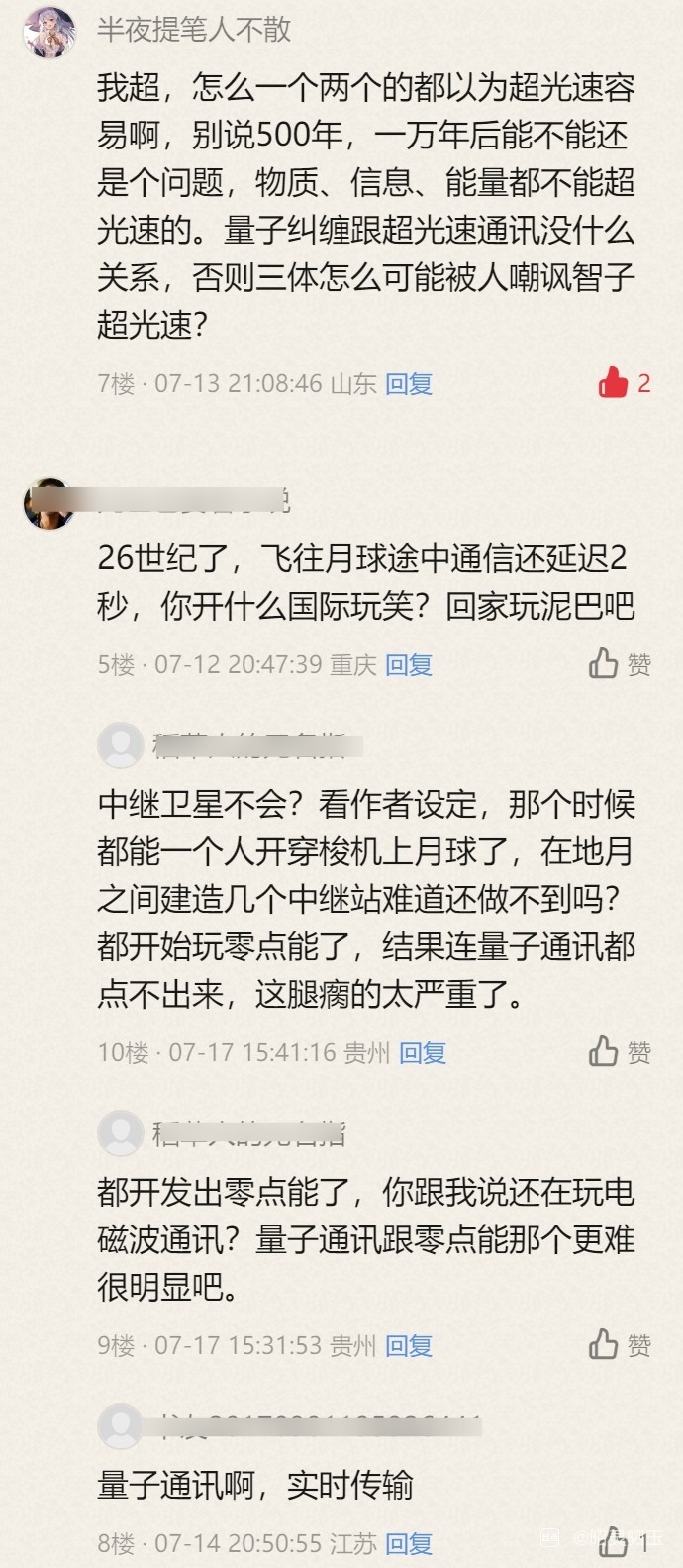 我一写网文小说的,都快成科普的了,难绷!截图里的书友“半夜提笔人不散”已经说了我就不多说了。帖都发了,再保姆级科普一下吧。所谓“量子通讯”是指对信息加密上的百分百不可被技术性破解,而不是指传播信息的速度能超光速实时通信,这是两码事!量子纠缠虽具备超距作用,但无法超光速传递有效信息,所以量子纠缠本身这个物理现象是不违背因果律,也不违背物质、信息不能超光速这一物理定律。地月距离约38万千米,光速传播约30万千米,信息传播速度最快就是等于光速,地月一个来回,光速传播也要2秒多一点。最难绷的是,截图里说的中继卫星什么的,是彻底蚌埠住了。你就是在地月距离内建1万个中继卫星,他还是得走完70多万千米的一个来回的地月距离啊,难道建了中继卫星,地月距离38万千米就瞬间消失啦?或者说就变成3.8万千米啦?地月38万千米的距离是客观存在的物理实在啊。真弄中继卫星,接收解析再发送还得耗费点时间,导致总延迟还更大了,所以真难绷啊只要物理学大厦基石仍然由“相对论”和“量子场论”主导,光速不变原理就是物理铁则,物质、信息都不能超光速。此外,还看到一个书友说的,原话:[人类从工业时代到信息时代都只花了100年,不敢想象500年后会膨胀到什么地步,你这句话就说明了你被现在人类的理论物理给框住了,你再怎么样也和古代农民想象皇帝用金锄头锄地一眼,思维固化。]哥!你难道不知道人类能进入信息时代就是建立在“相对论”和“量子场论”这两大物理基石下的产物吗?从相对论诞生至今100来年,基础科学虽有所突破,但都是边角料,是对现有物理学大厦的修补。而真正像“牛顿力学”到爱因斯坦“相对论”、“量子场论”这种颠覆原有物理学大厦级别的超级突破,至今一百多年过去了也没有发生,也许再过一百年也没有。就算人类文明从牛顿时代到爱因斯坦时代的突破,也足足隔开了300年。当然,不排除500年后会有这种级别的颠覆式突破,甚至50年后说不定就天降猛人,出现堪比爱因斯坦的猛人给你突破了,这是有可能的,未来的事情你可以说它一切皆有可能。但是,即便500年后没有这种级别的科学突破,它也是十分正常的呀,你不能说500年后就100%必然突破吧?这才是不正常的。未来的事情会怎样咱们都不知道,所以一切皆有可能发生,没毛病吧?认同吧?好!那500年后“不会突破”这个事也是属于其中的一种可能性,没毛病吧?所以作者菌只是在开篇设定选择了这种可能性,以此展开故事情节。写这么多也未必有人看到这,就这样吧。