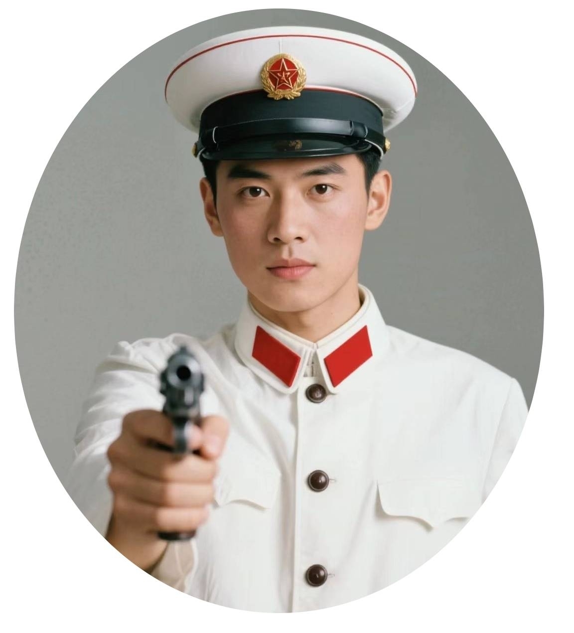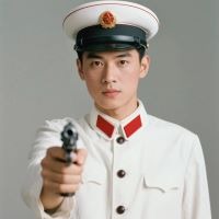 上衣为白色,头戴白色大檐帽,帽徽为国徽,两边的衣领为两块鲜红的领章。