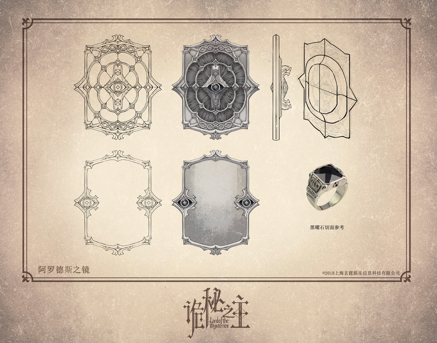 外形:花纹奇异的古老银镜,镜子的两边有黑色宝石装饰成眼睛。