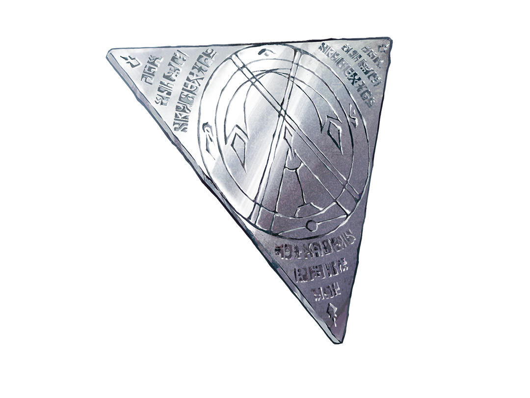 黑夜教会的常见低阶符咒,对应黑暗途径,能够安抚鬼魂、幽影、僵尸和水鬼,一定程度上对付怨魂和恶灵。外形为三角形的银制薄片,薄片之上布满常人难以看懂的赫密斯语单词和各种充满象征意义的符号、数字、标识。