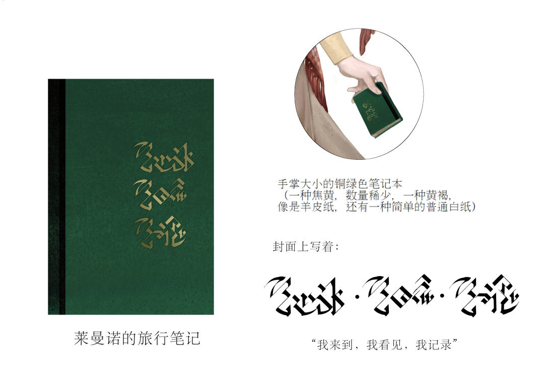 外形:一本巴掌大小的笔记,外壳看起来很硬,呈铜绿色,显得颇为古老。笔记内页共由三种纸张构成,一种焦黄,数量稀少,一种黄褐,像是羊皮纸,大约十张,一种就是简简单单普普通通的白纸,封皮之上,则有一行古弗萨克语书写的单词:“我来到,我看见,我记录。”