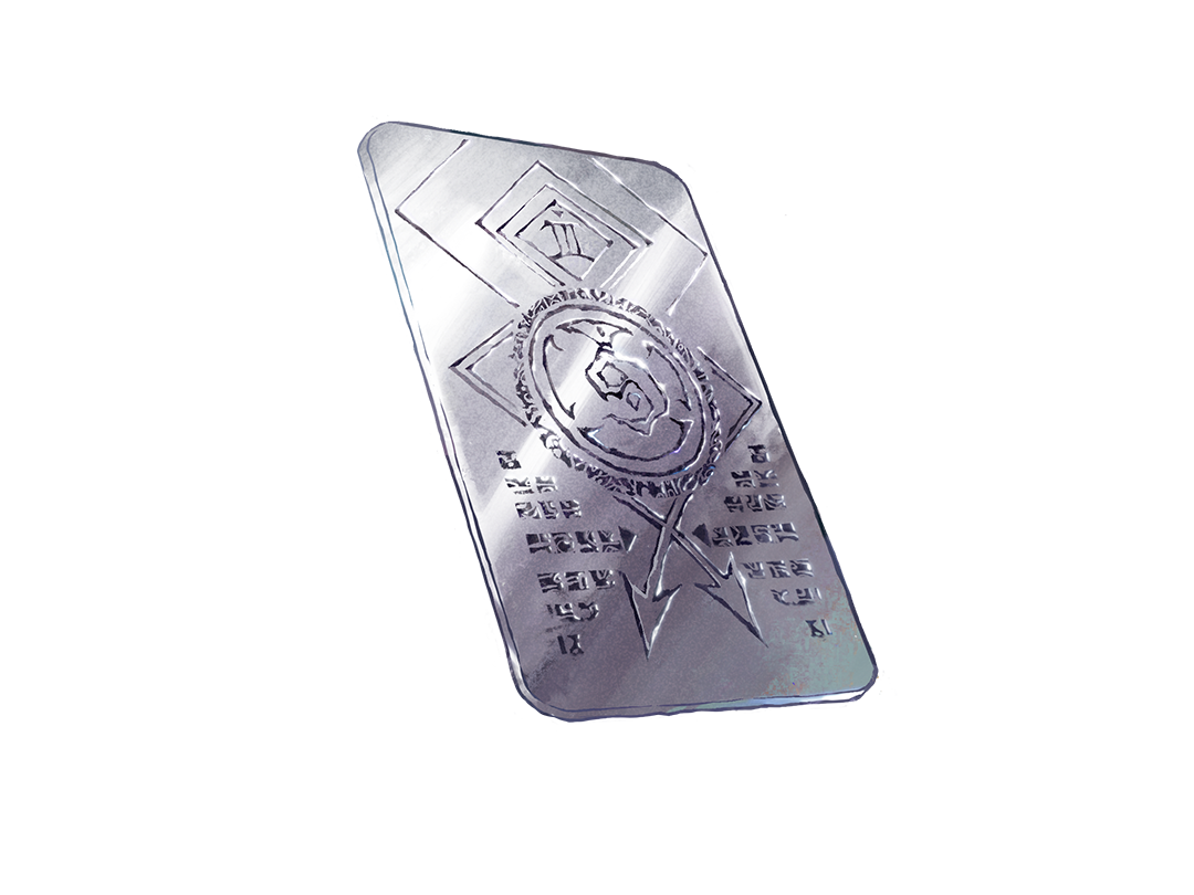 黑夜教会的常见低阶符咒,效果类似于不眠者途径 序列8午夜诗人,能让人宁静让人入睡的吟唱。外形为长方形的银制薄片,正面和反面都雕刻着赫密斯语书写的咒文,以及象征符号、对应灵数和魔法标识。